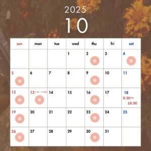 10月の営業日のお知らせ 2025.10.06 10月の営業日のお知らせです。4日は私用のため休診とさせていただきます。18日は9:30~16:00までの営業とさせていただきます。ご迷惑をおかけしますが、よろしくお願いいたします。 記事のタイトルとURLをコピーする 9月の営業日のお知らせ前の記事