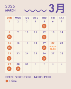 3月の営業日のお知らせ 2026.02.28 3月の営業日のお知らせです。20日(金曜日)は、祝日ですが午前中のみ営業致します。30日(月曜日)は、私用のため休診とさせていただきます。よろしくお願いいたします。 記事のタイトルとURLをコピーする Post Share Hatena Line RSS feedly Pin it note 重要なお知らせ前の記事